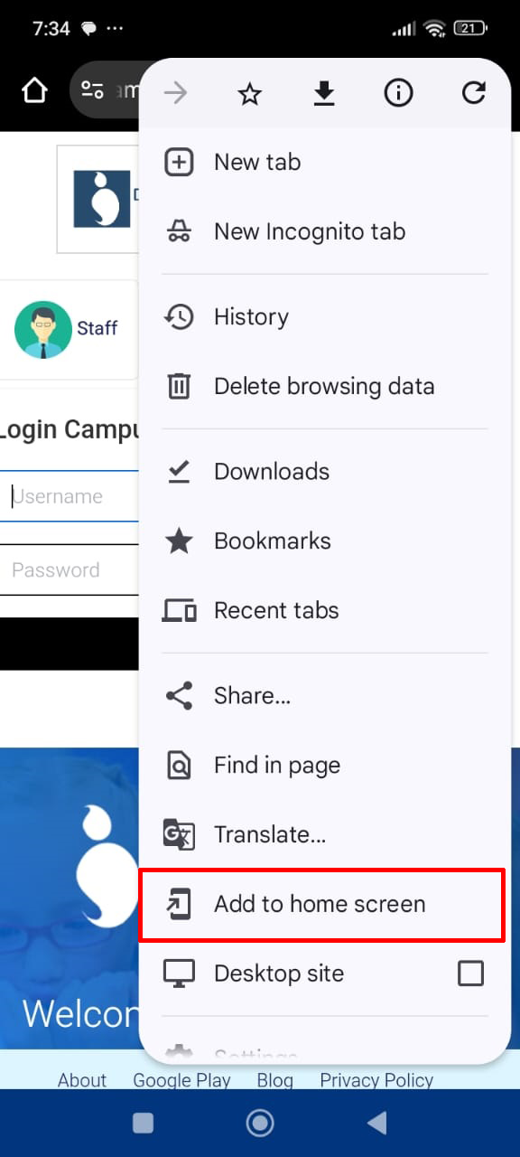 Click on the option Add to home screen