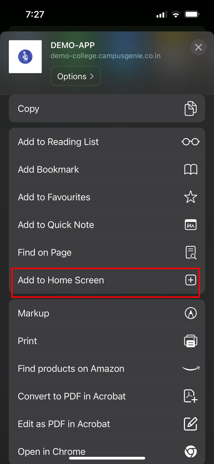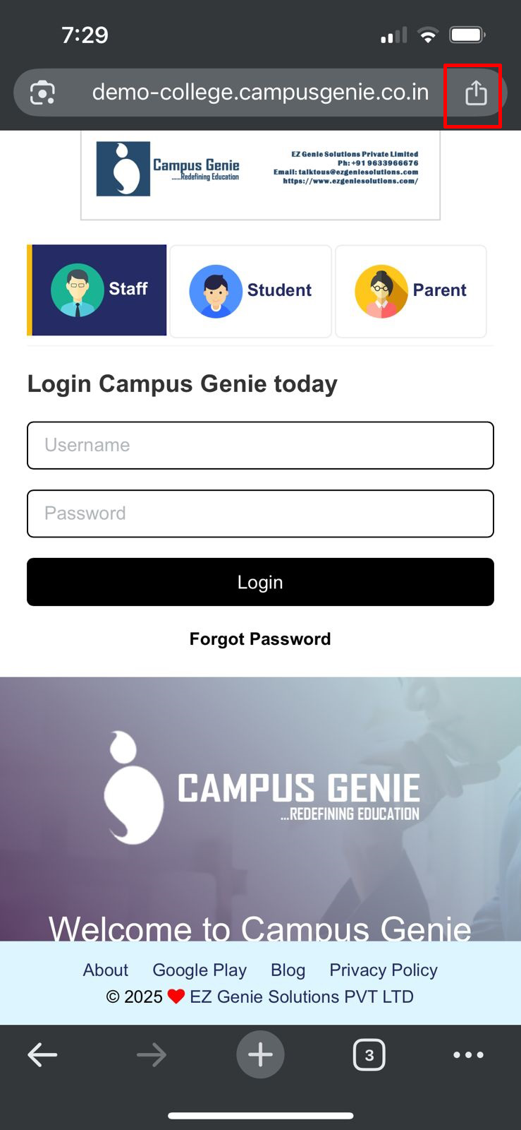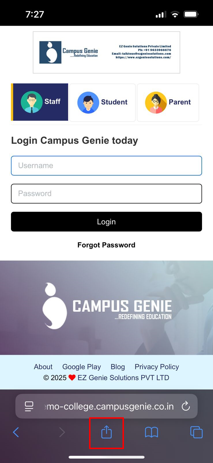 Safari browser on your mobile and type your campus url (https://dev-app.campusgenie.co.in) in the search bar, and click on the share icon